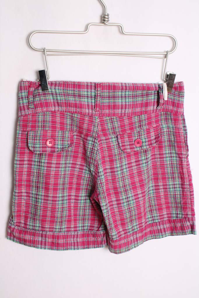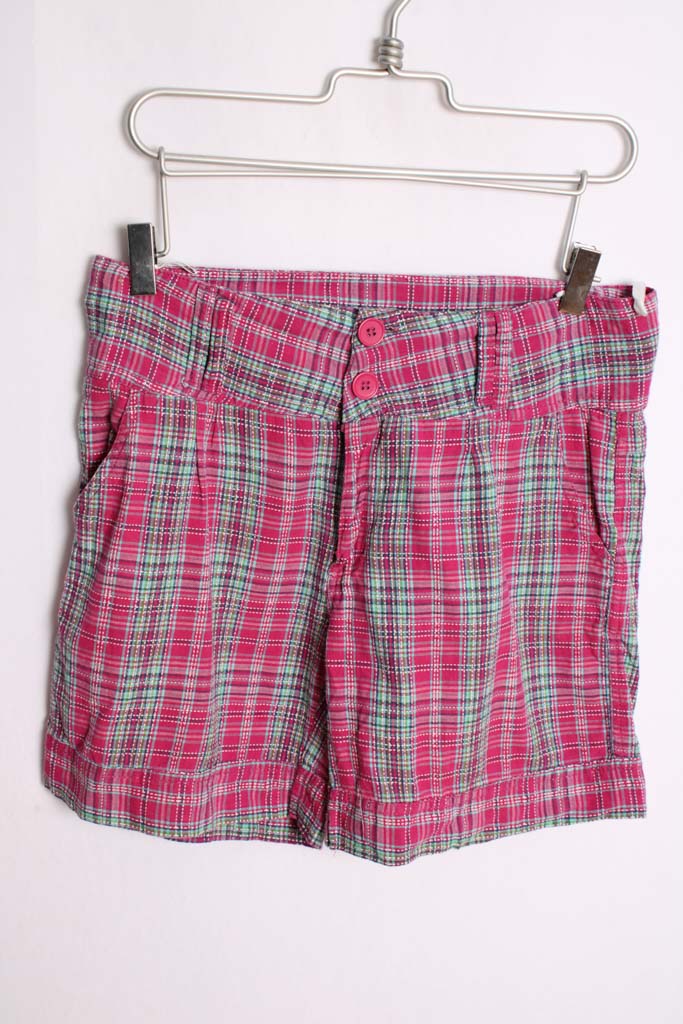 Bermudas vintage con estampado de cuadros rosas y verdes.