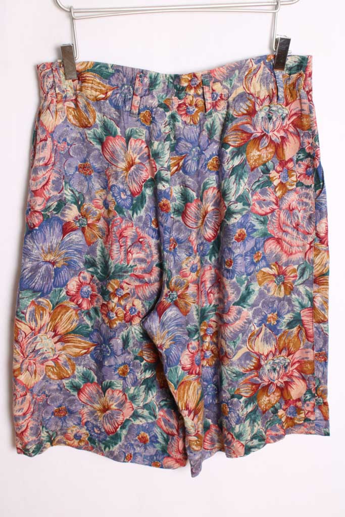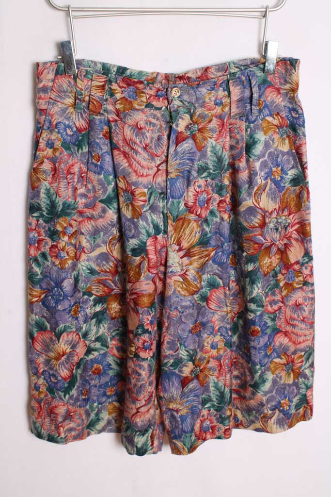 Bermudas vintage con estampado de flores en tonos azules y rojizos.