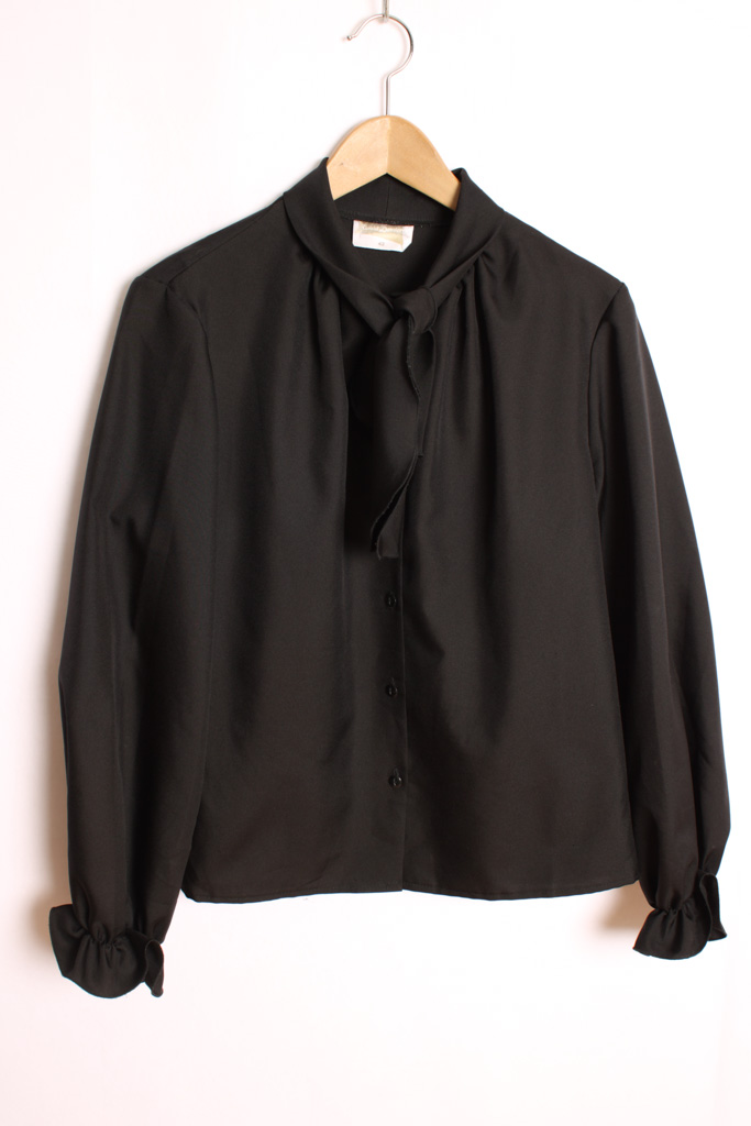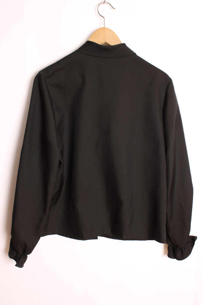 Blusa años 70 negra con volante en la manga y lazo en el cuello.