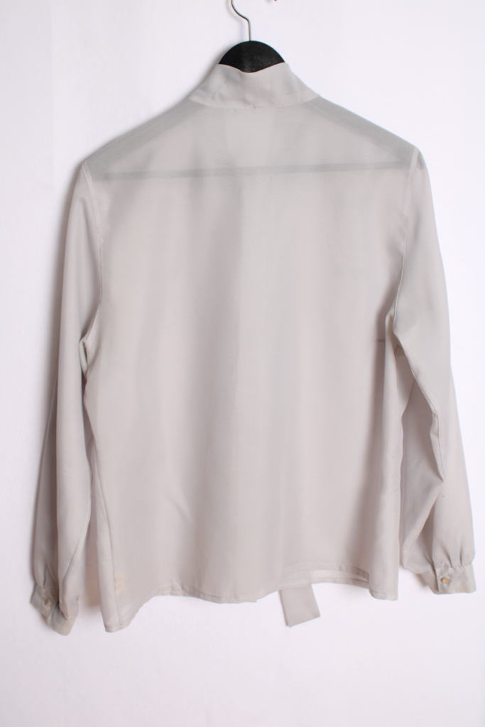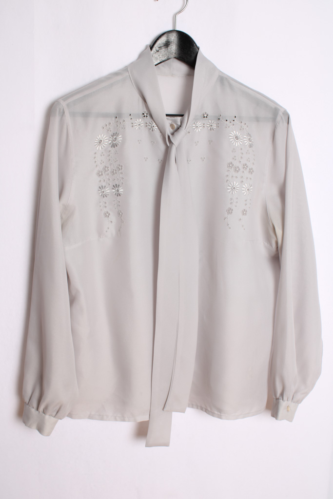 Blusa años 70 de manga larga semitransparente con flores perforadas y lazo al cuello.