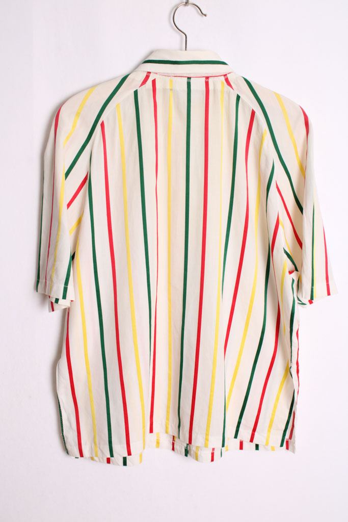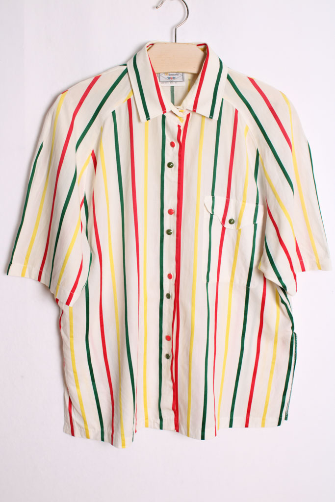Camisa blanca con estampado de rayas en tonos amarillo, verde y rojo con botones a juego.