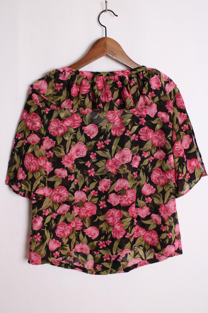 Blusa con estampado de flores en tonos verdes y rosas con cuello volante.
