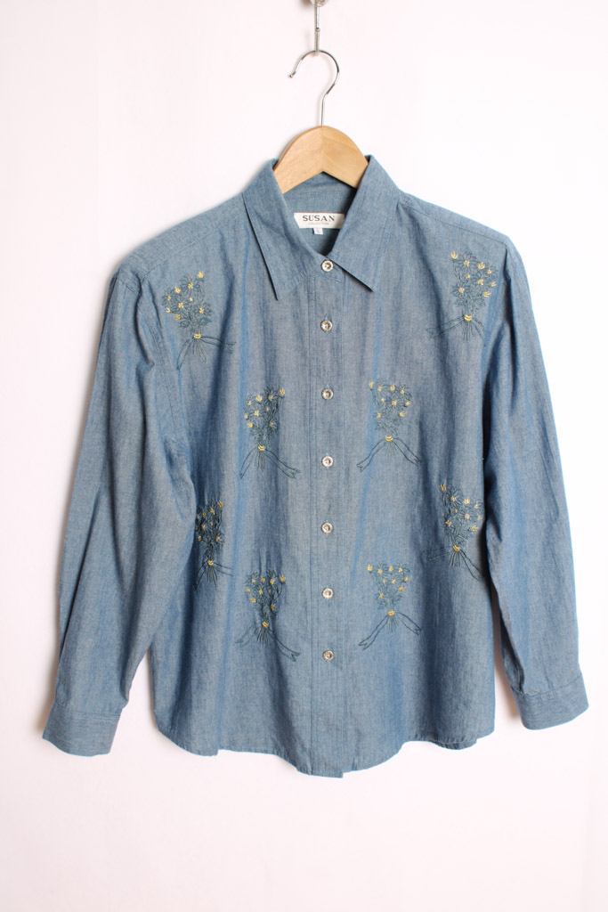 Camisa denim años 90 con estampado de ramilletes de flores con bordado dorado.
