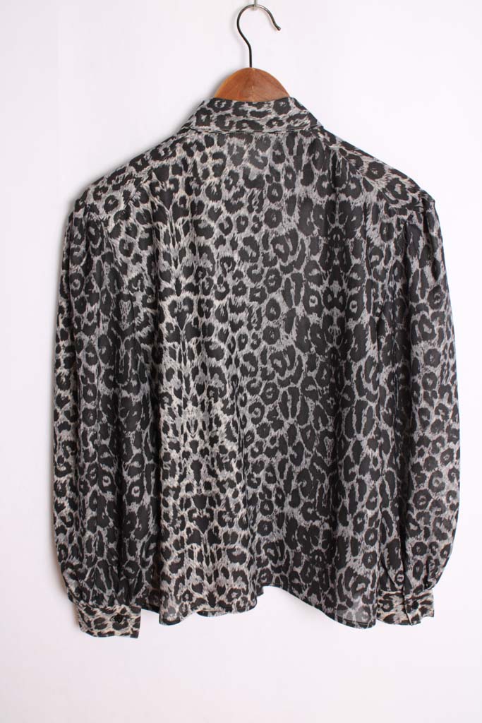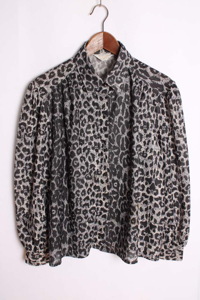 Blusa con mangas jamón de primavera vintage con estampado animal print en tonos gris y negro.