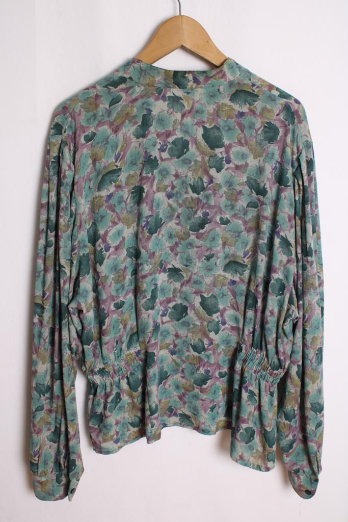 Camisa con estampado de flores efecto acuarela en tonos verdes y morados.