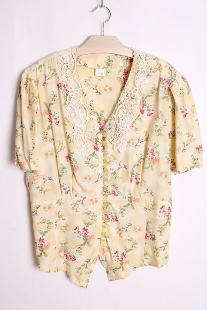 Camisa asimétrica con estampado amarillo con estampado de flores y cuello de puntilla.