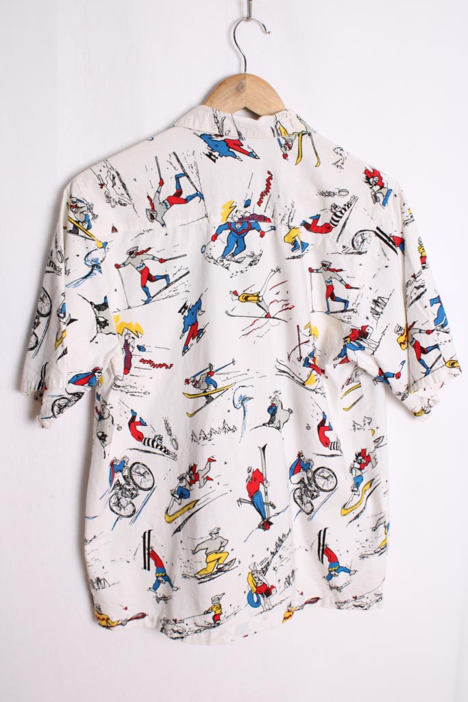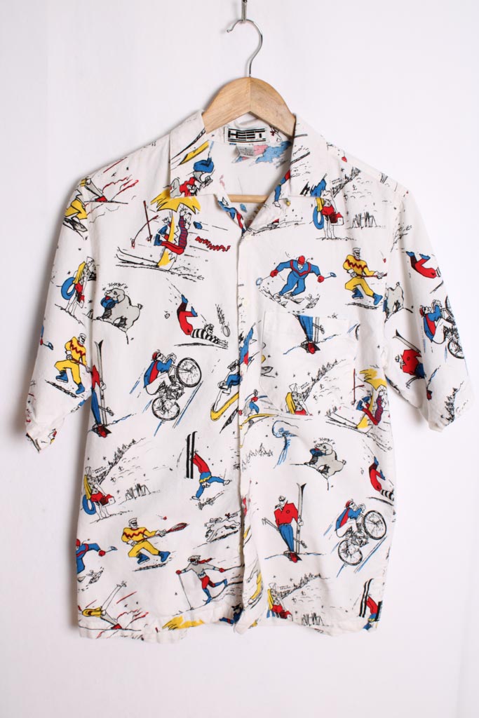 Camisa de verano blanca para chico con estampado de deportistas en tonos azules, rojos y amarillos.