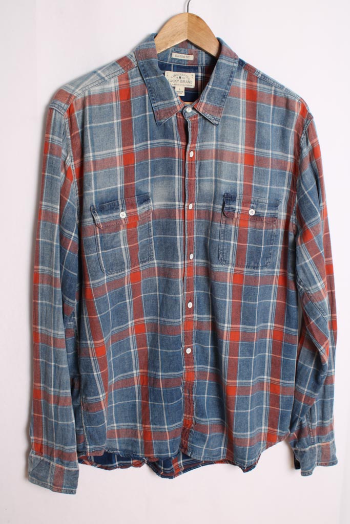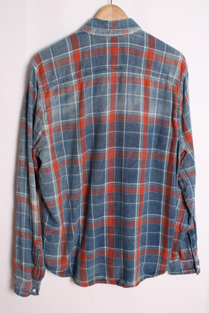 Camisa tipo denim de cuadros en tonos azul y naranja efecto desgastado.