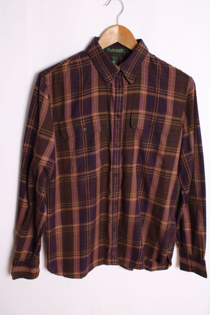 Camisa de mujer de cuadros en tonos berenjena, marrón, rosa… de Ralph Lauren.