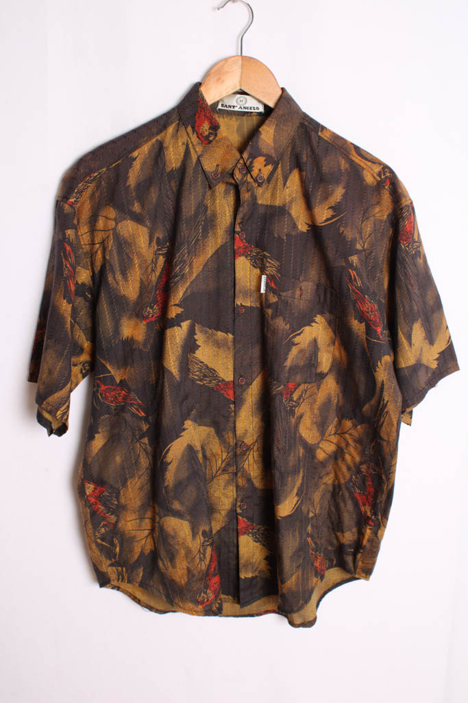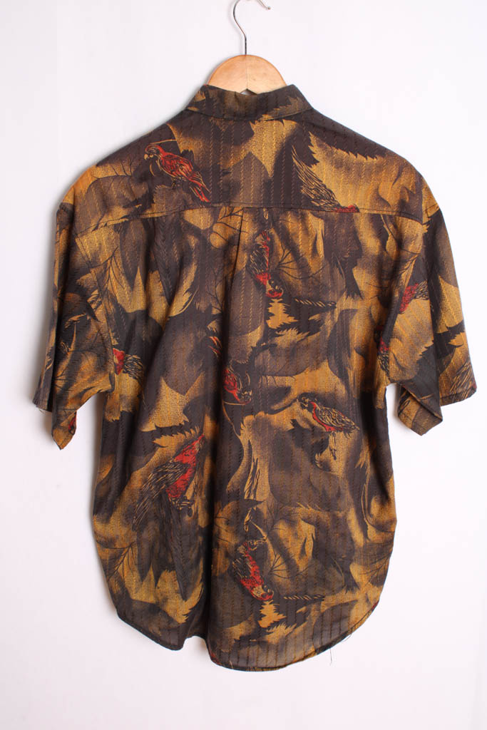 Camisa vintage de verano en tonos grisáceos y dorados con estampado de loros rojos.