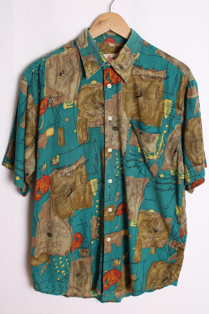 Camisa vintage de verano con estampado de flores abstractas en tonos verdes.