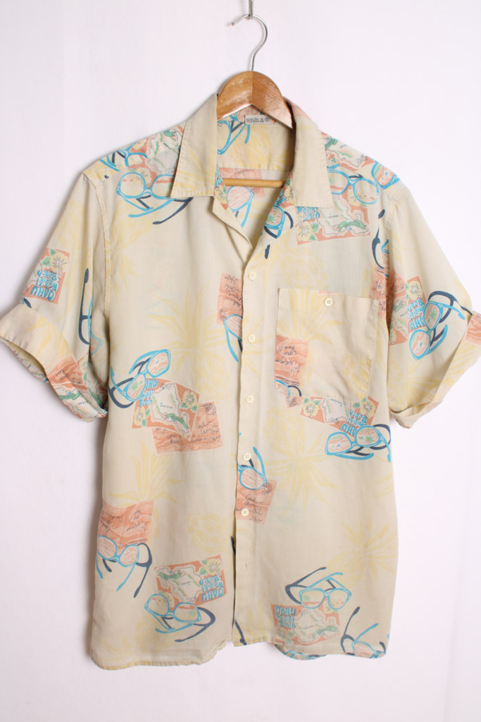 Camisa de verano hawaina amarillo pastel para chico con estampado de mapas y gafas.