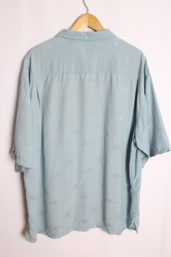 Camisa hawaiana en tono azul pastel con estampado de flamencos.