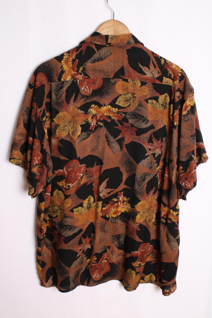 Camisa vintage de verano de estilo hawaiano en colores negro y marrón con estampado de hojas de otoño y zorros.