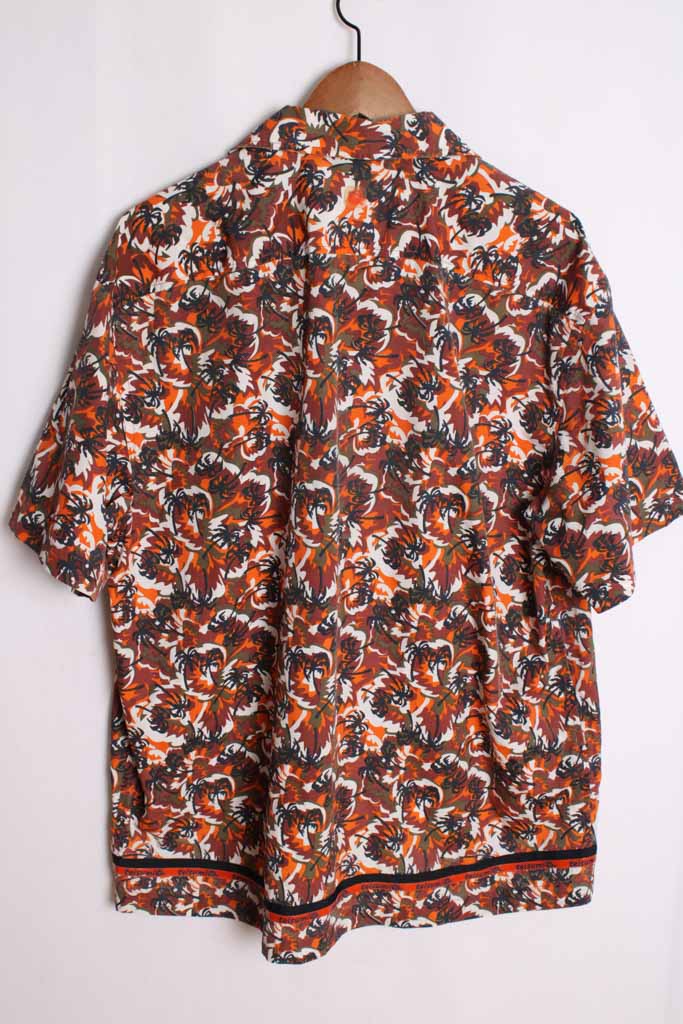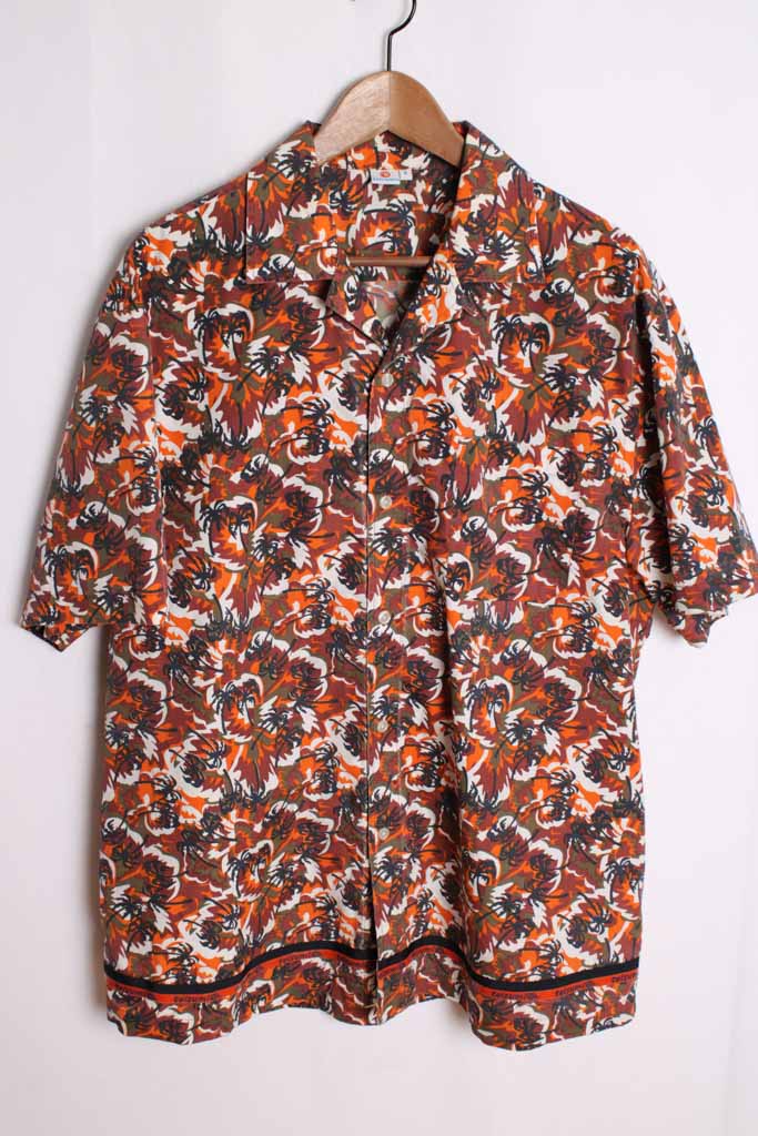 Camisa vintage de verano con estampado hawaiano en colores caldera, negro y naranja.