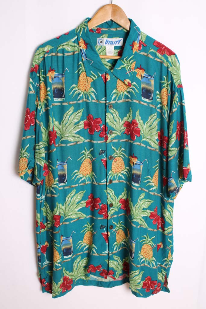 Camisa vintage de verano con estampado hawaiano en color verde con piñas y bebidas.