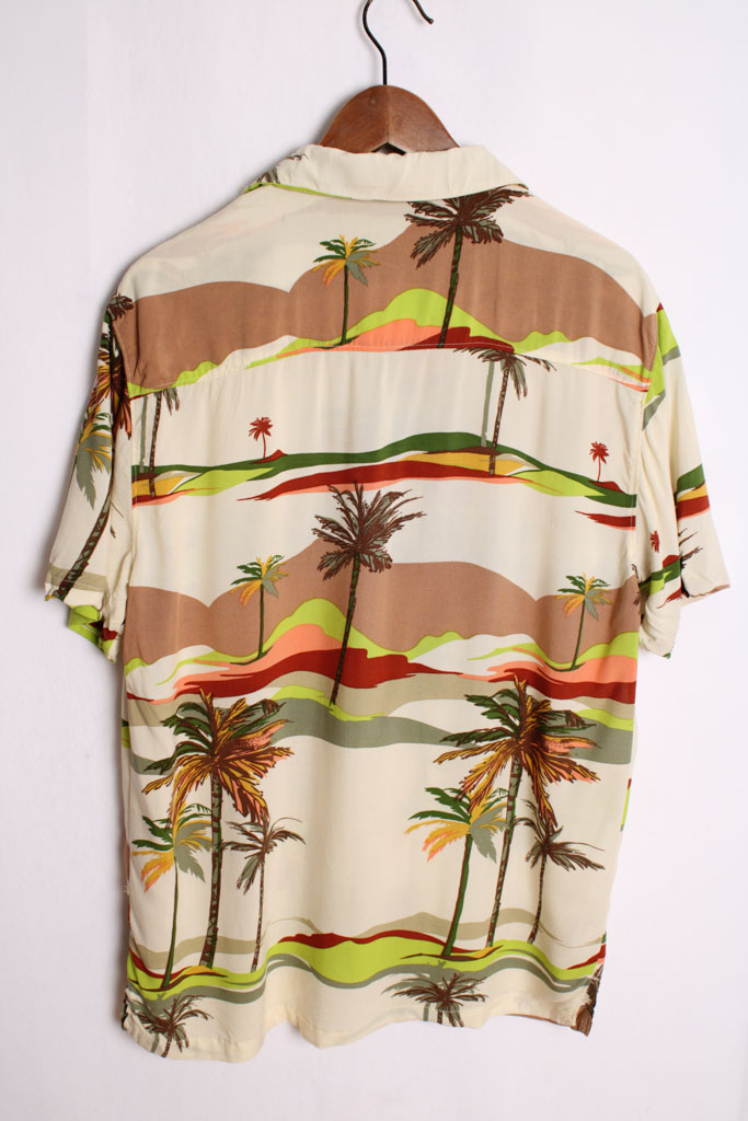 Camisa de verano hawaiana para chico con estampado en tonos beige y camel con palmeras y detalles en tonos flúor.