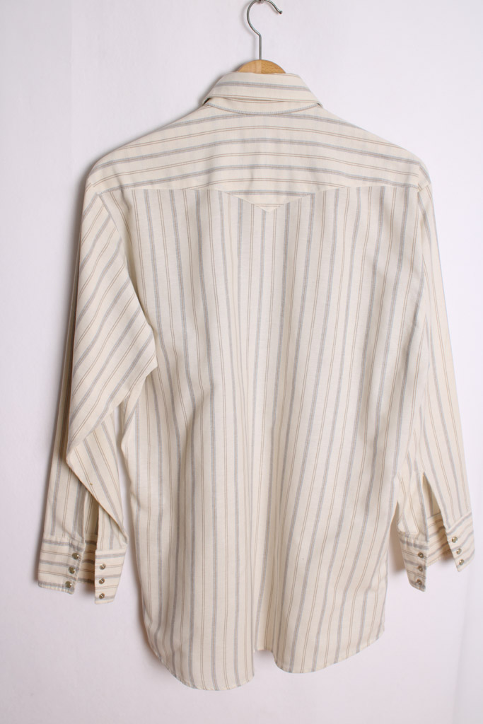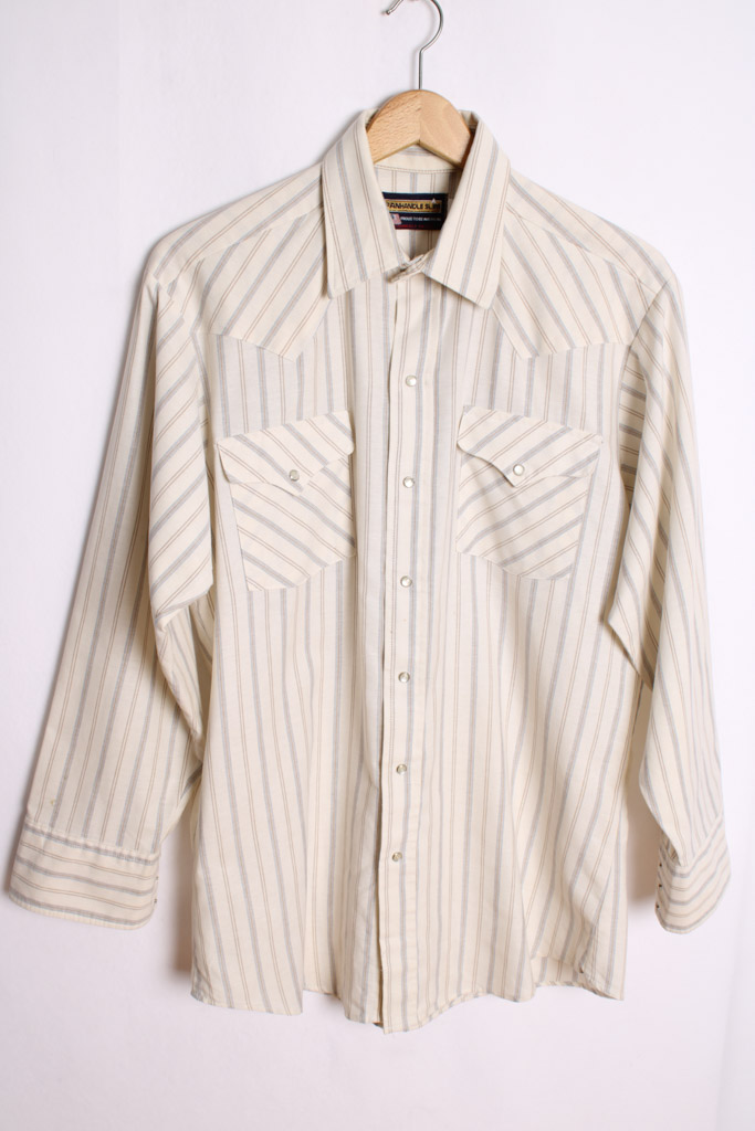 Camisa vintage de estilo western de la marca Panhandle en color beige con rayas verticales y botones de nácar.
