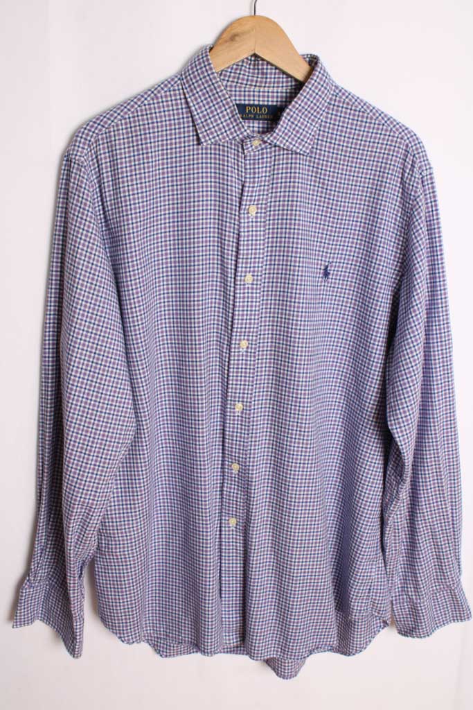 Camisa de la marca Ralph Lauren con estampado de cuadros en tonos blanco, lila y azul.