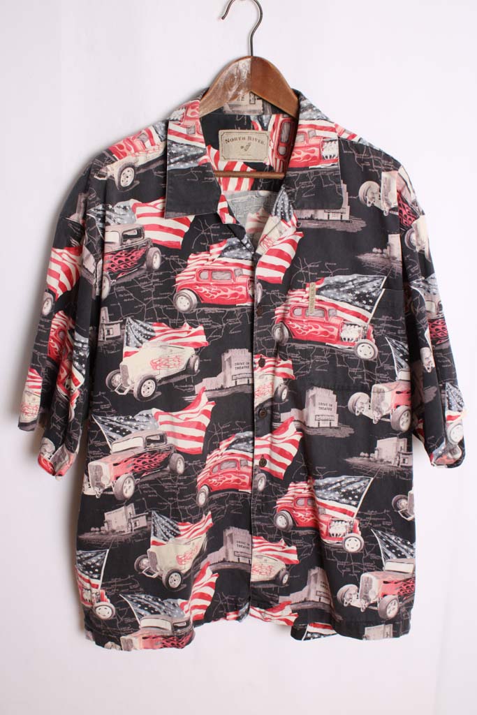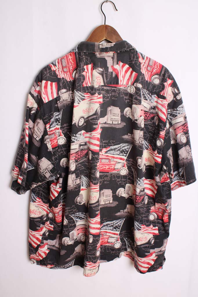 Camisa vintage de verano con estampado de banderas USA y coches hot rod.