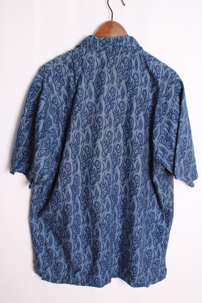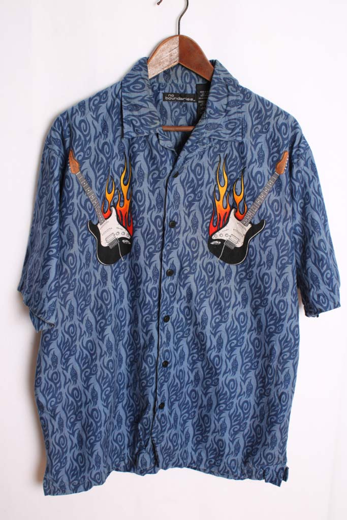 Camisa en tonos azules con estampado de tribales con detalles de guitarras con fuego.