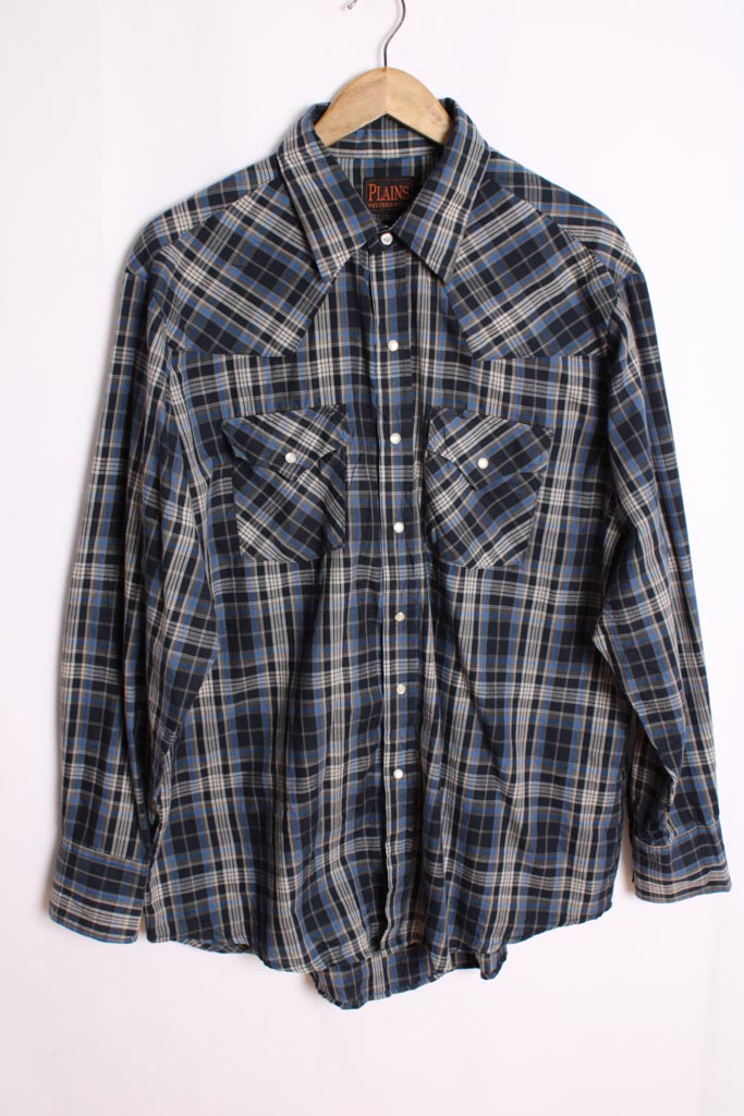 Camisa vintage estilo western de la marca  Plains en cuadros de colores azules.
