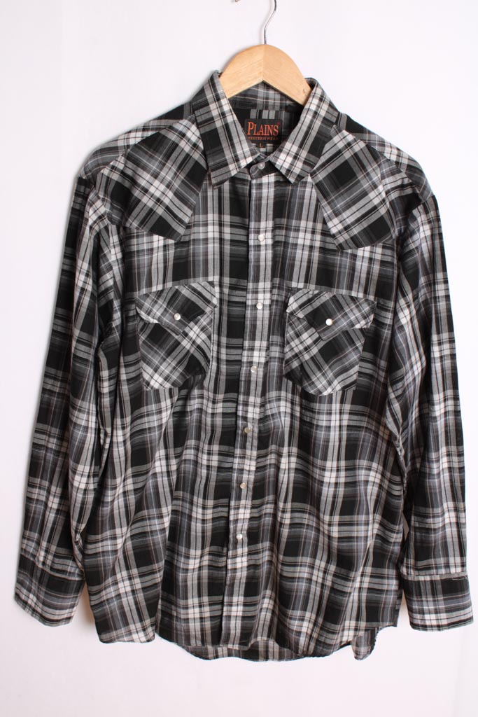 Camisa western vintage para hombre en cuadros de color negro y gris con botones de nácar.