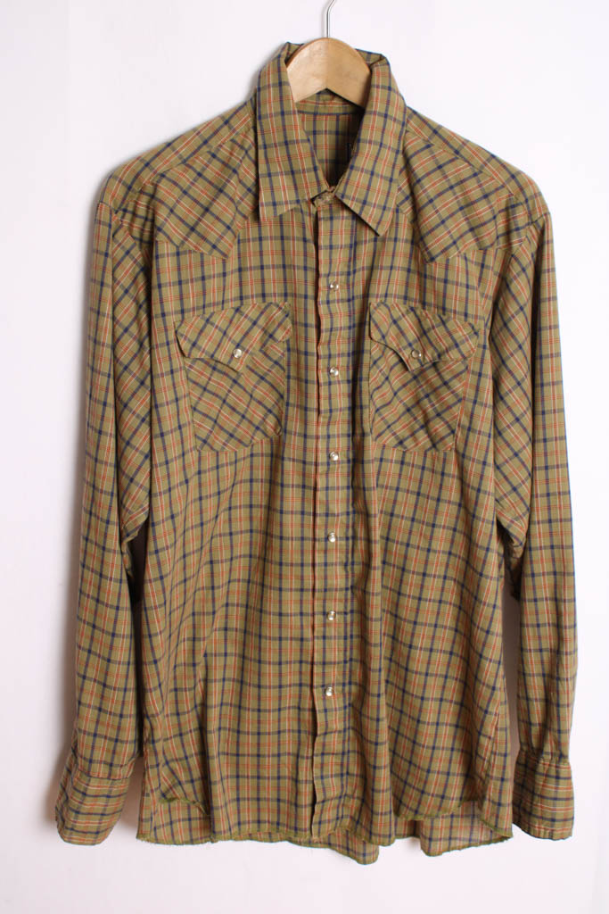 Camisa vintage estilo western para hombre en cuadros de color verde con botones de corchete.