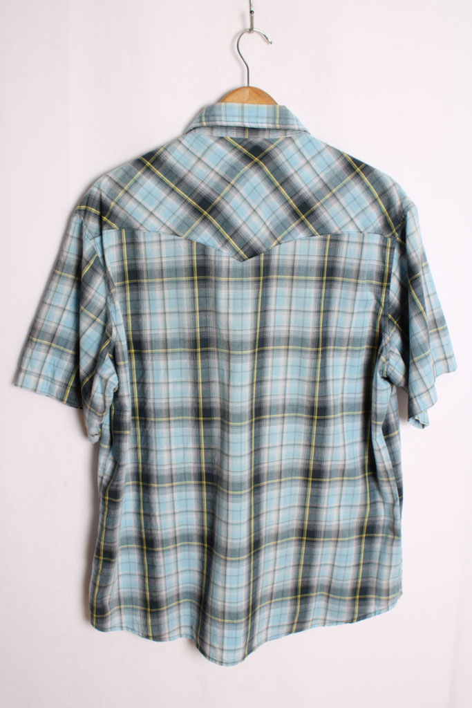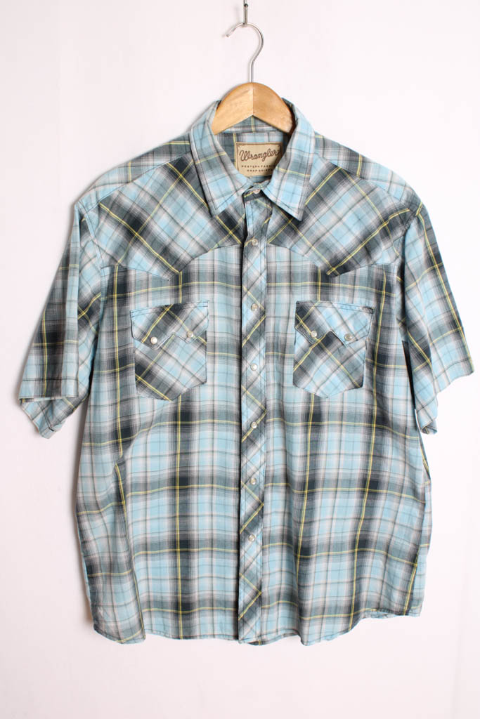 Camisa western de manga corta de Wrangler de cuadros en tonos azules y amarillos.