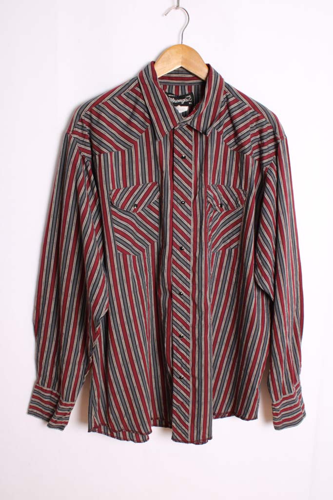 Camisa vintage estilo western para hombre de la marca Wrangler en rayas de colores burdeos y gris.