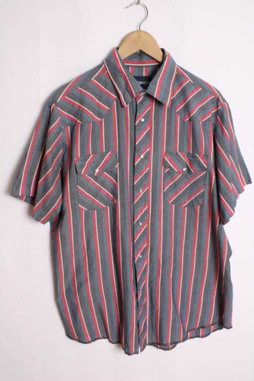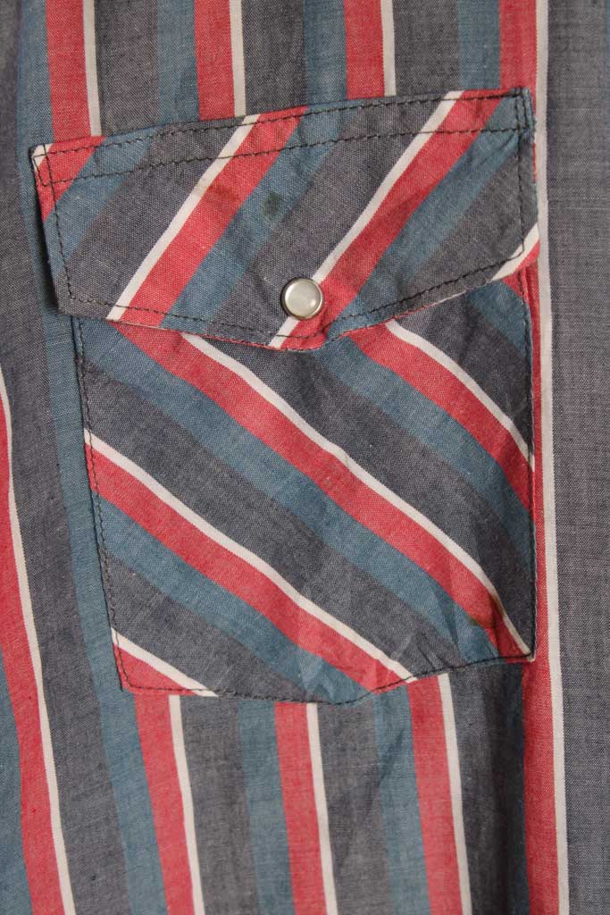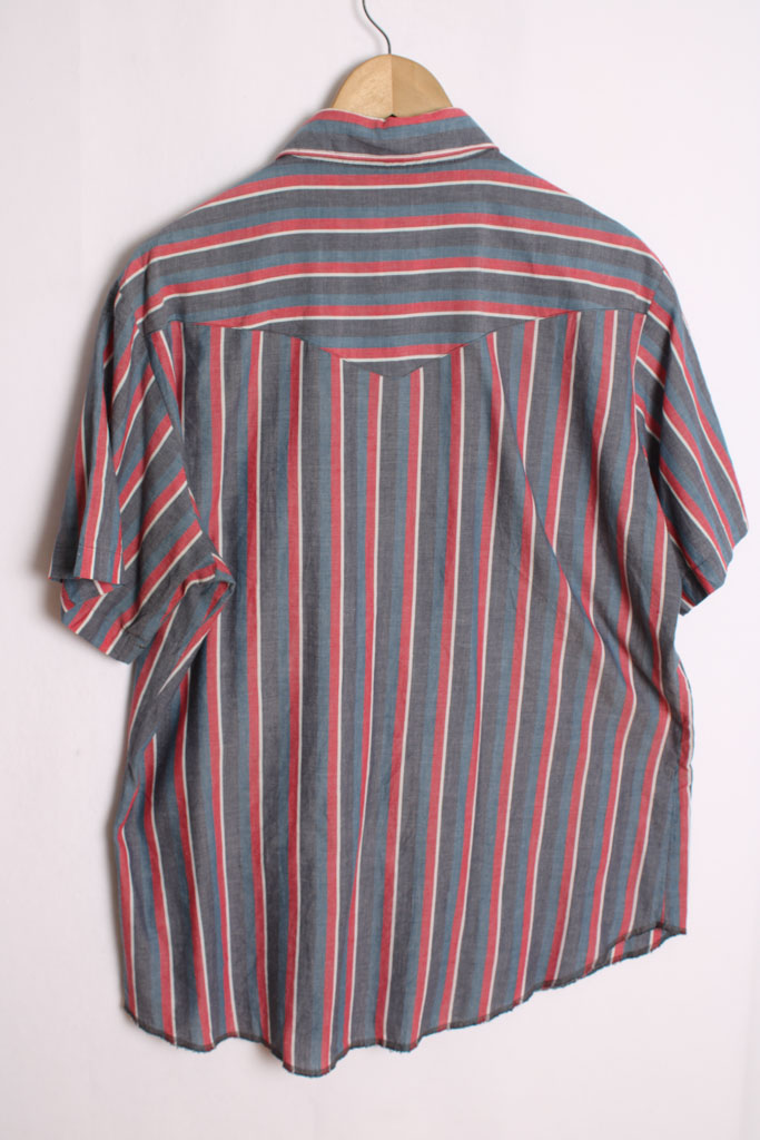 Camisa vintage estilo western de la marca Wrangler en rayas de colores azul, gris y rojo.