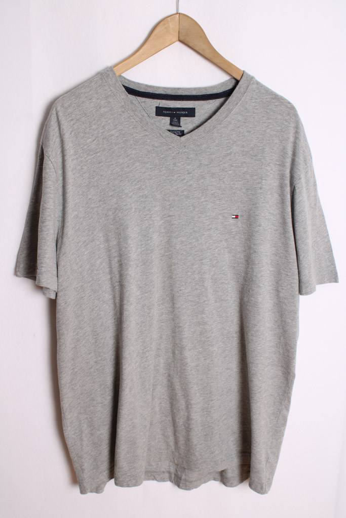 Camiseta vintage de la marca Tommy Hilfiger en color gris con cuello de pico.