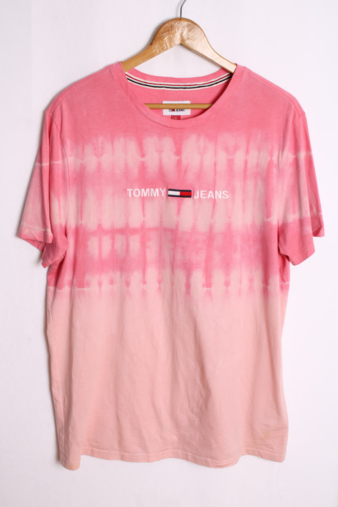 Camiseta vintage unisex de Tommy Hilfiger con estampado tiy dye en tonos rosas.