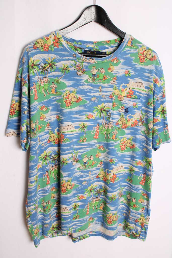 Camiseta unisex vintage de Ralph Lauren con estampado hawaiano de frutas y bailarinas de hula.