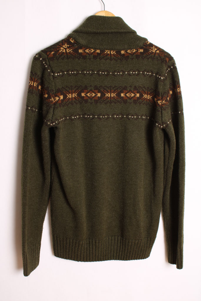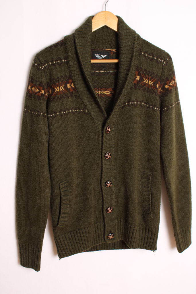 Cárdigan vintage para hombre en color verde con cenefa en los hombros.