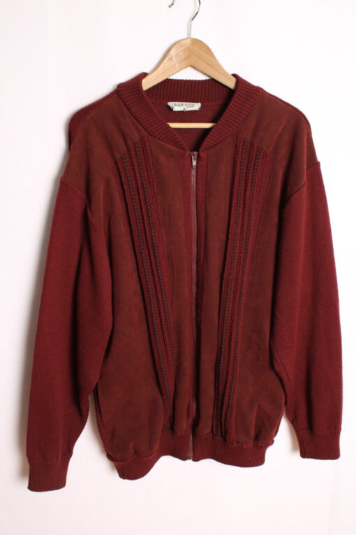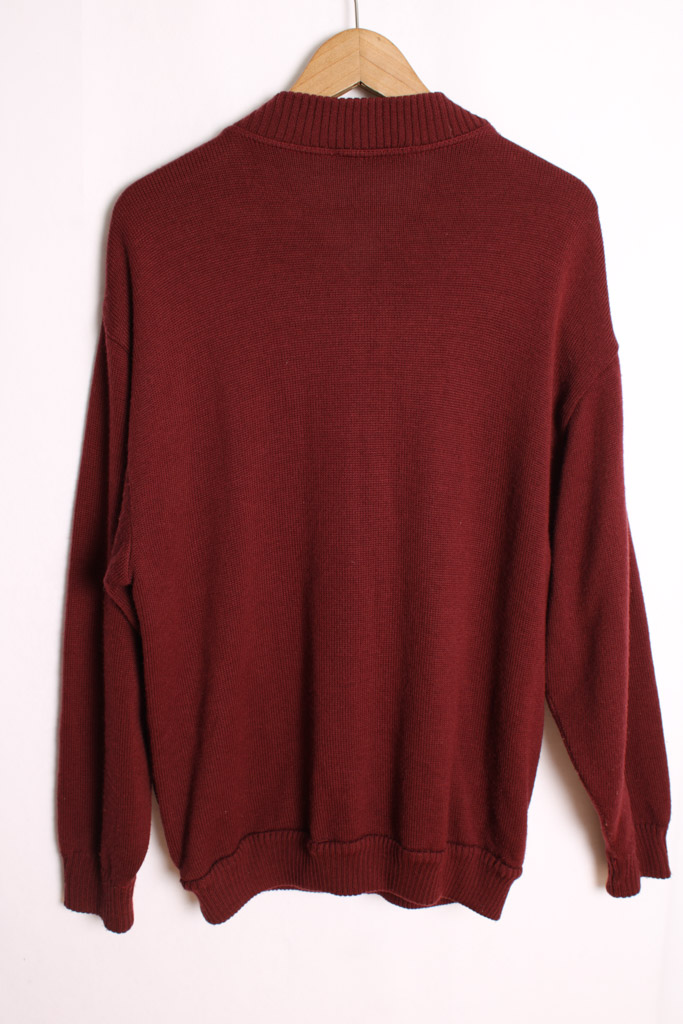 Cárdigan vintage para hombre en color granate con tejido acanalado.