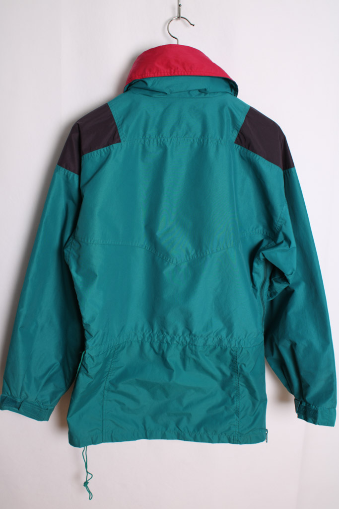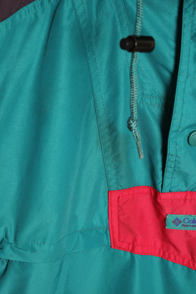 Cazadora tipo canguro vintage de la marca Columbia en color verde con capucha escondida en el cuello.