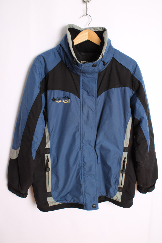 Cazadora vintage  para mujer de la marca Columbia Challenge series en colores azul y negro con capucha escondida en el cuello.