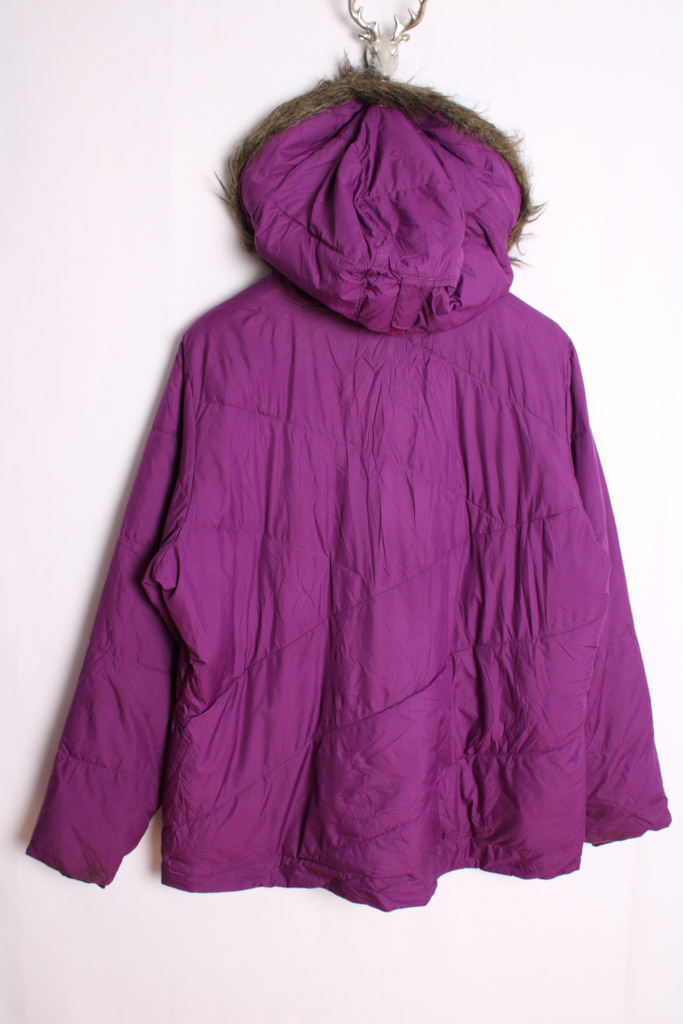Cazadora Columbia tipo pluma en morado con capucha con detalle pelo. Capucha desmontable.