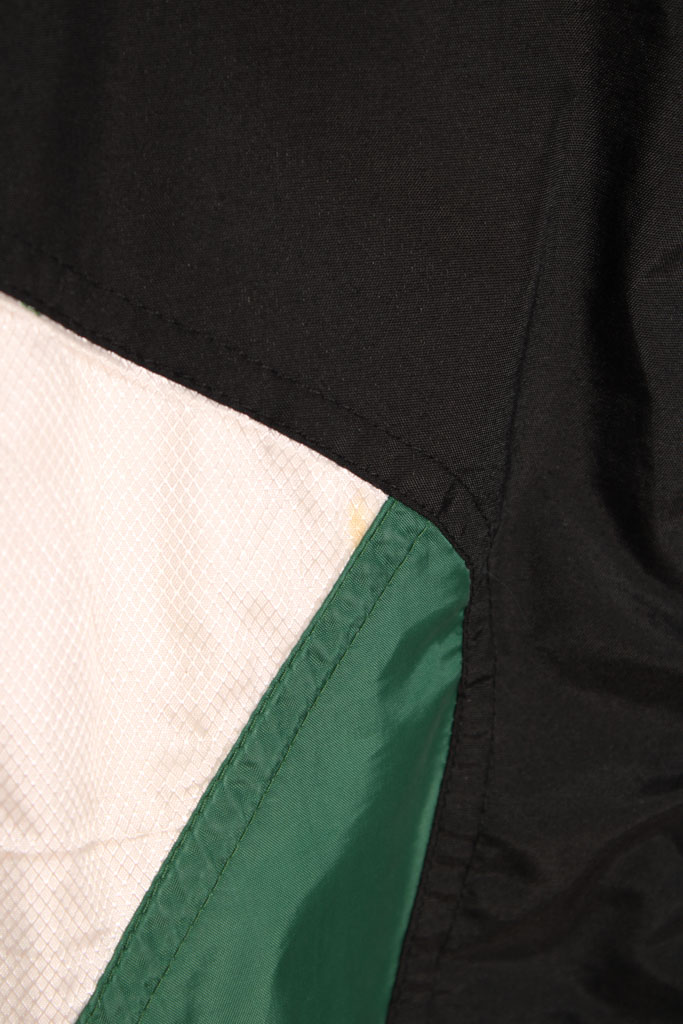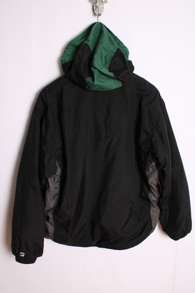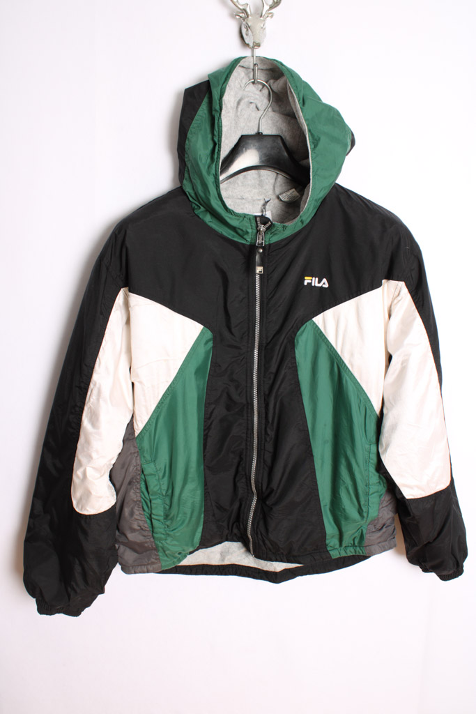 Cazadora deportiva vintage de la marca Fila en colores negro, blanco y verde con capucha e interior de tejido polar gris.