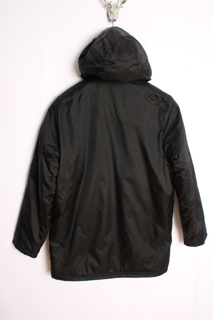 Cazadora deportiva de la marca Adidas en color negro con capucha incorporada.