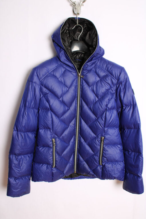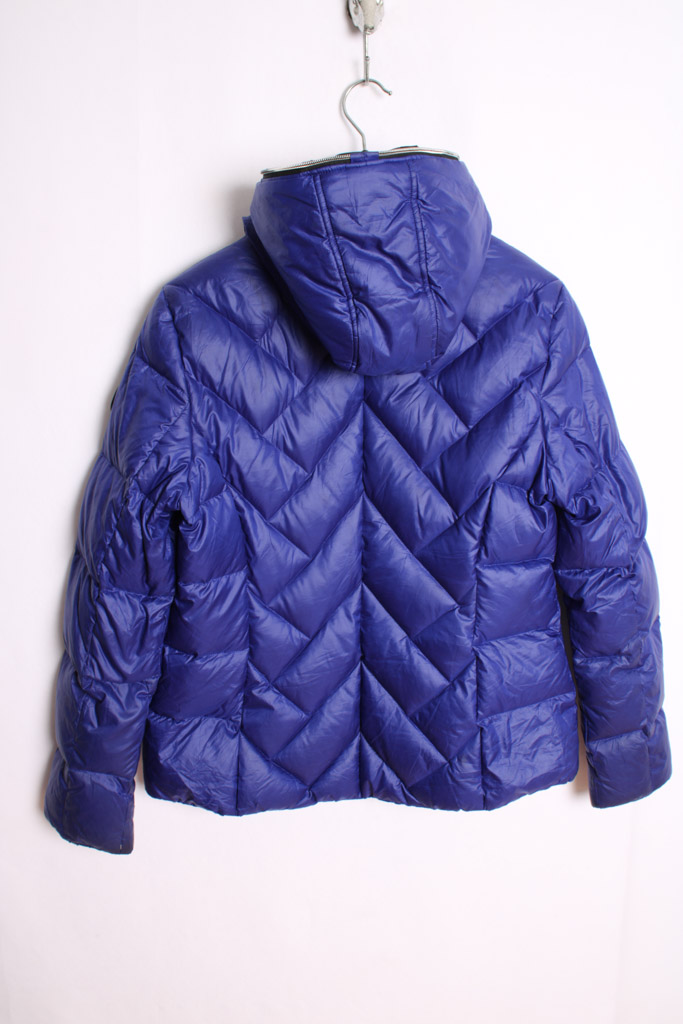 Chaquetón plumífero de Guess en color morado con capucha integrada.