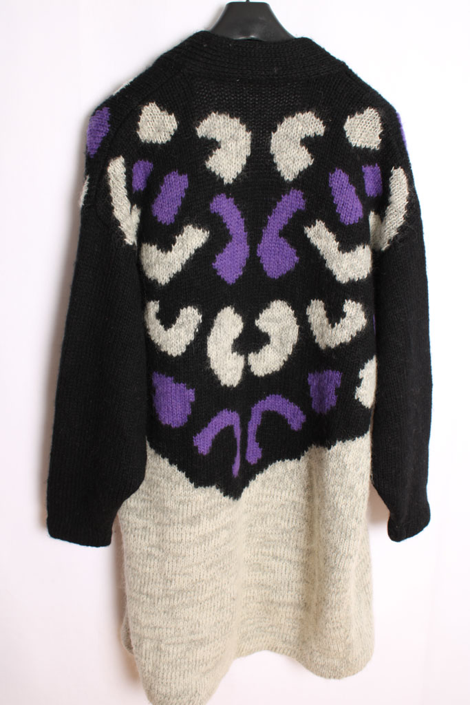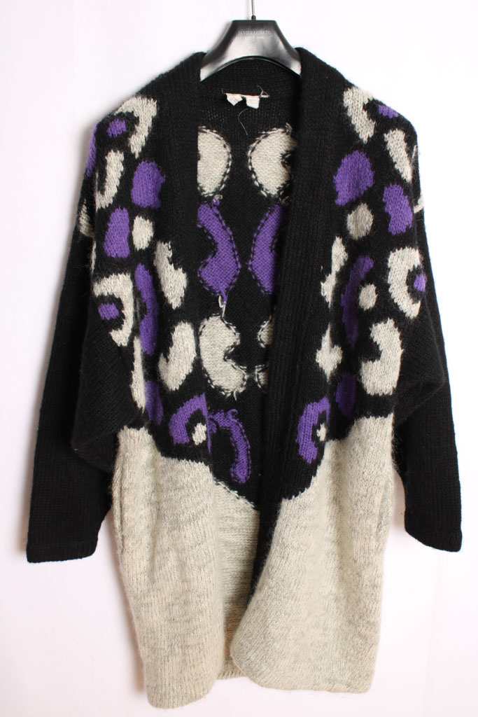 Chaqueta abierta larga en tono negro y gris con estampado en tonos grises y morados.
