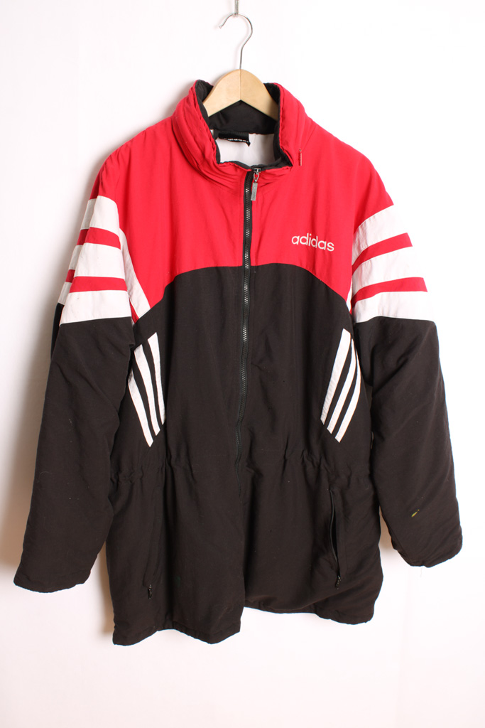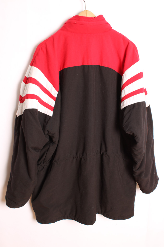 Chaquetón deportivo de Adidas en tonos negro, blanco y rojo. Capucha extraible en el cuello*