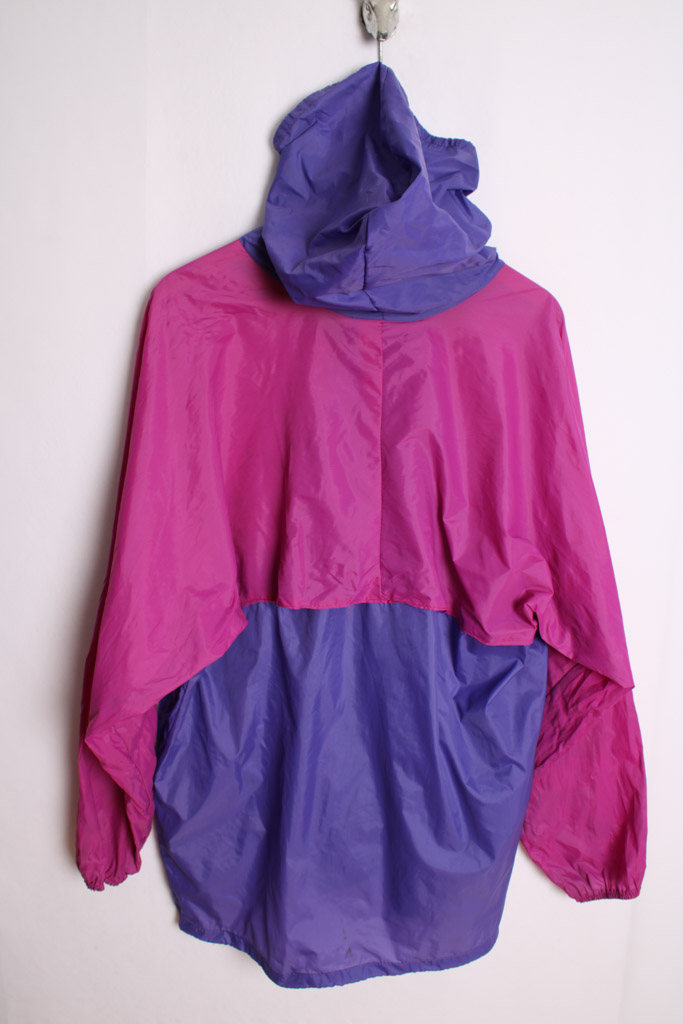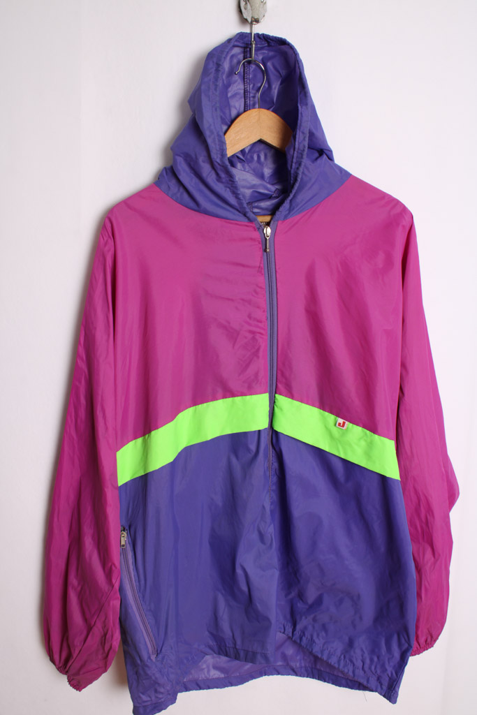 Chaqueta deportiva chuibasquero con capucha en tonos fucsia, morado y naranja flúor.