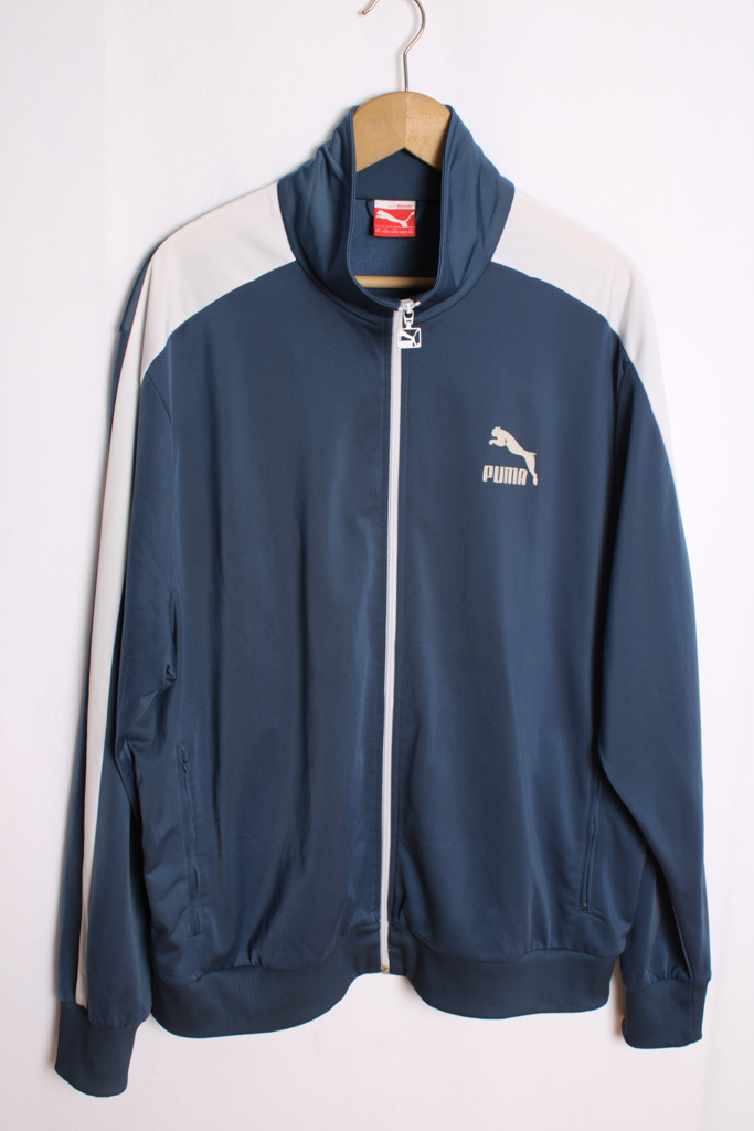 Crazy jacket vintage deportiva de la marca Puma en color azul con bandas blancas.