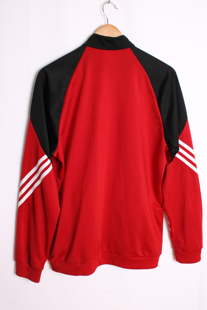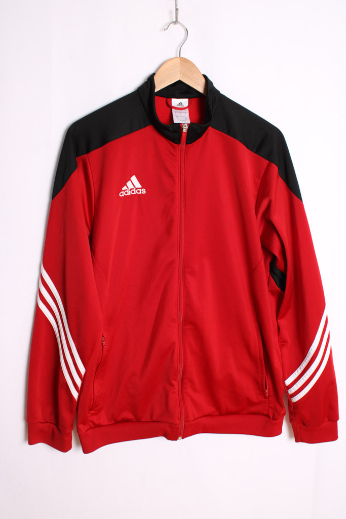 Chaqueta deportiva de Adidas en color rojo con detalles en negro y blanco.