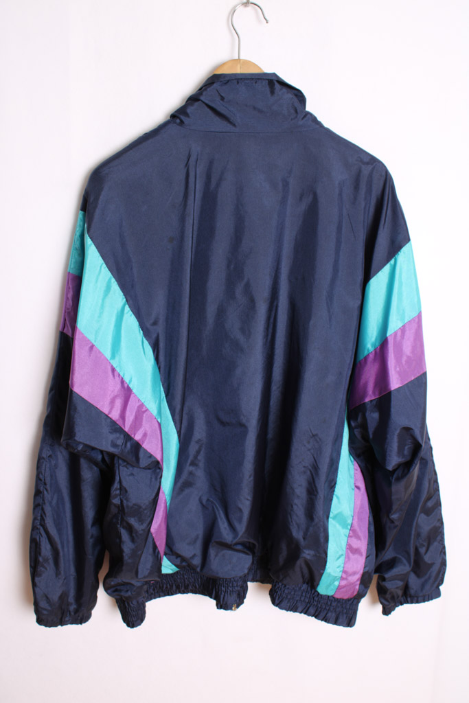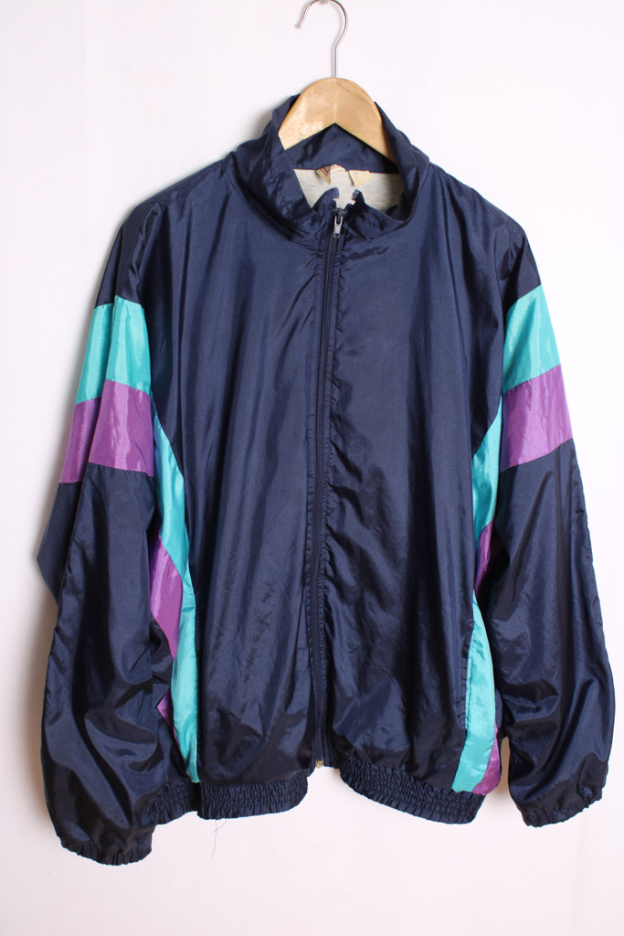 Crazy jacket vintage en color azul marino con detalles en turquesa y morado.