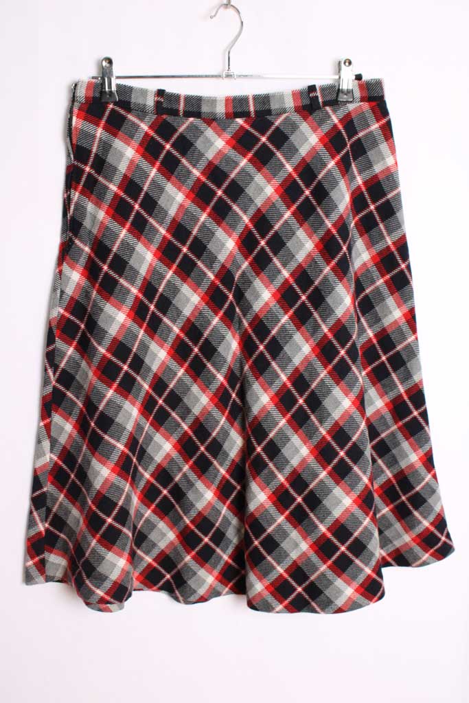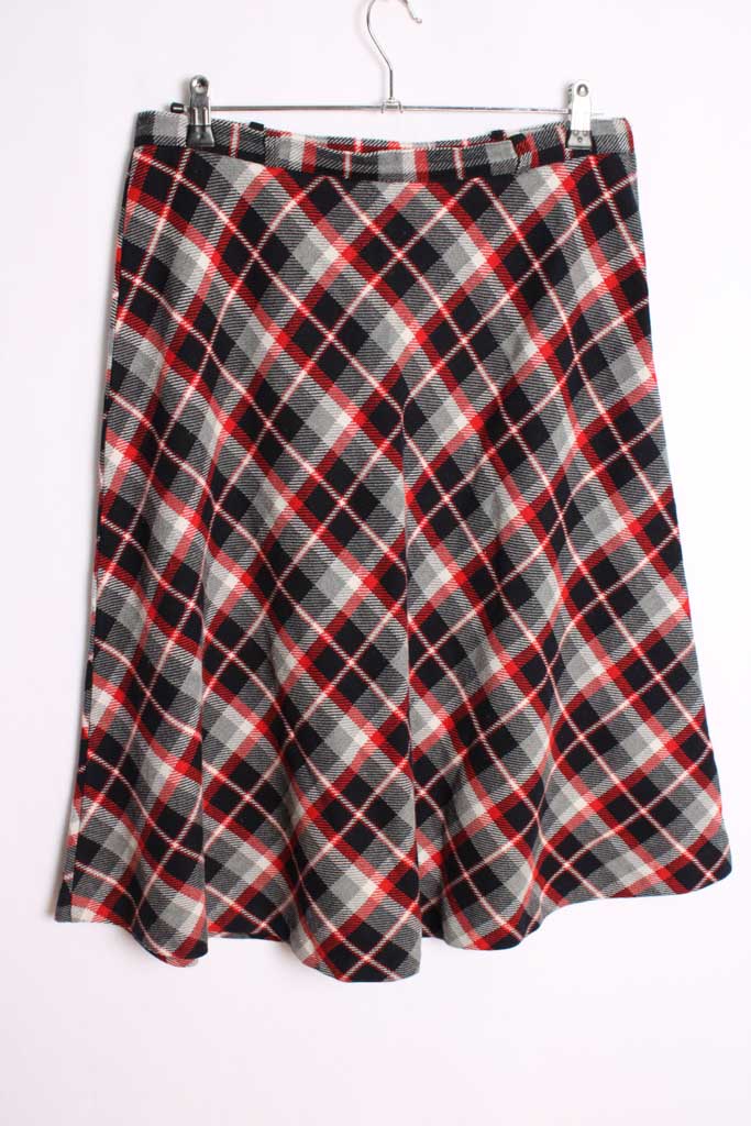 Falda vintage de invierno hecha a mano en cuadros de colores gris, negro y rojo.