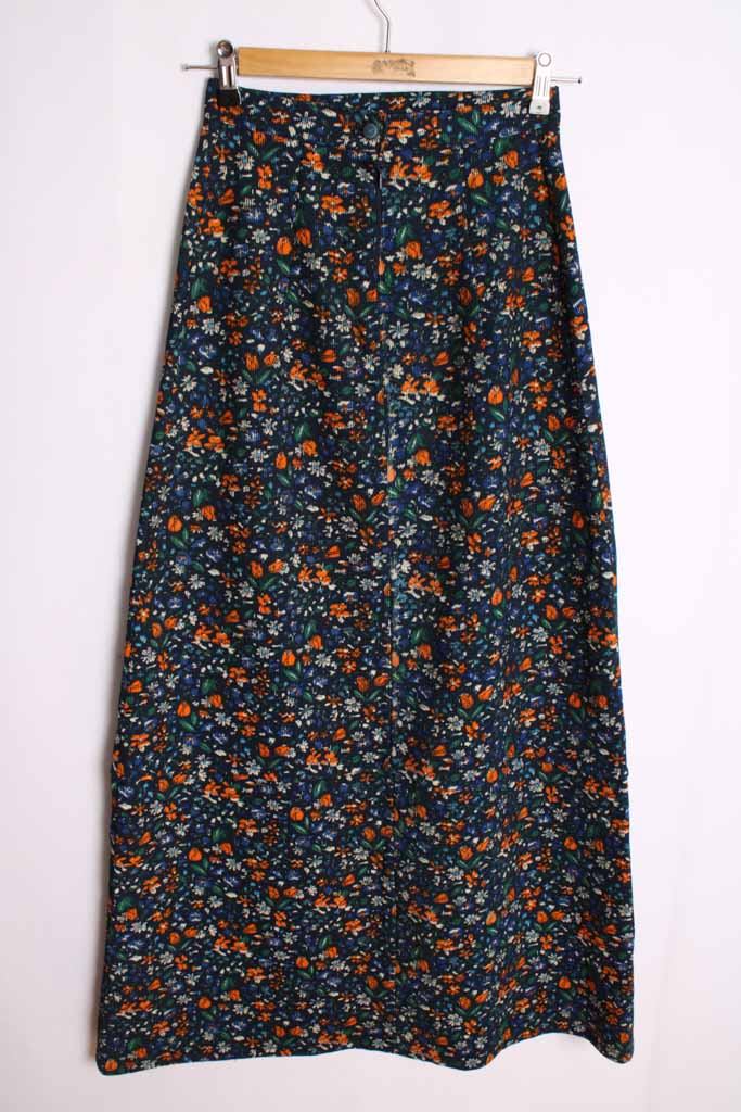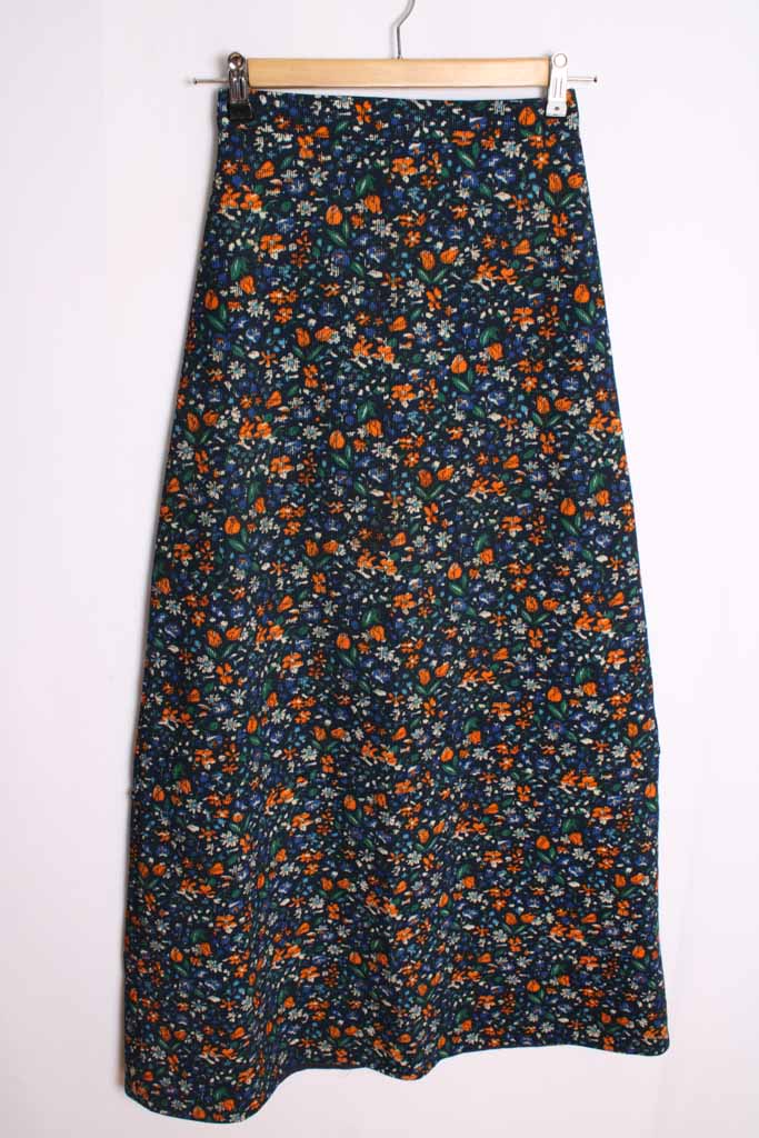 Falda de largo maxi de tejido de pana azul marino con estampado de flores liberty en tonos naranja, azul,, verde…